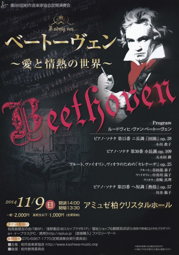 | プログラム | 作曲:ルードヴィヒ・ヴァン・ベートーヴェン ピアノ・ソナタ 第15番 ニ長調 「田園」op.28 ピアノ・ソナタ 第30番 ホ長調 op.109 フルート、ヴァイオリン、ヴィオラのための「セレナーデ」 op.25 ピアノ・ソナタ第23番 ヘ短調 「熱情」 op.57 |