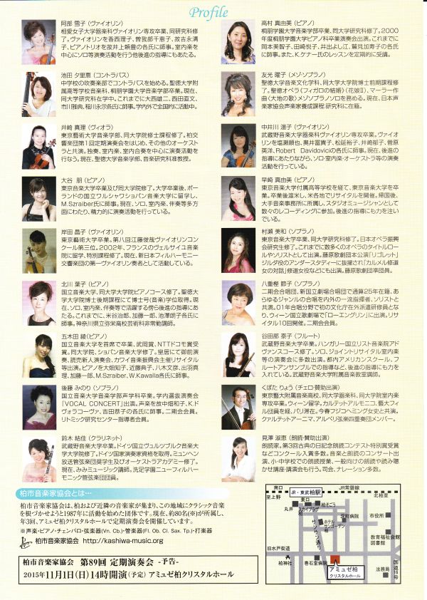 | 出演 | 阿部 雪子 (ヴァイオリン) 池田 夕里恵(コントラバス) 井崎 真理 (ヴィオラ) 大谷 朋 (ピアノ) 岸田 晶子 (ヴァイオリン) 北川 葉子 (ピアノ) 五木田 綾 (ピアノ) 後藤 みのり(ソプラノ) 鈴木 結佳 (クラリネット) 高村 真由美(ピアノ) 友光 曜子 (メゾソプラノ) 中井川 温子(ヴァイオリン) 早崎 真由美(ピアノ) 村瀬 美和 (ソプラノ) 八重樫 節子(ソプラノ) 谷田部 泰子(フルート) 【賛助出演】 くぼたりょう(チェロ) 見澤 淑恵 (朗読) |
